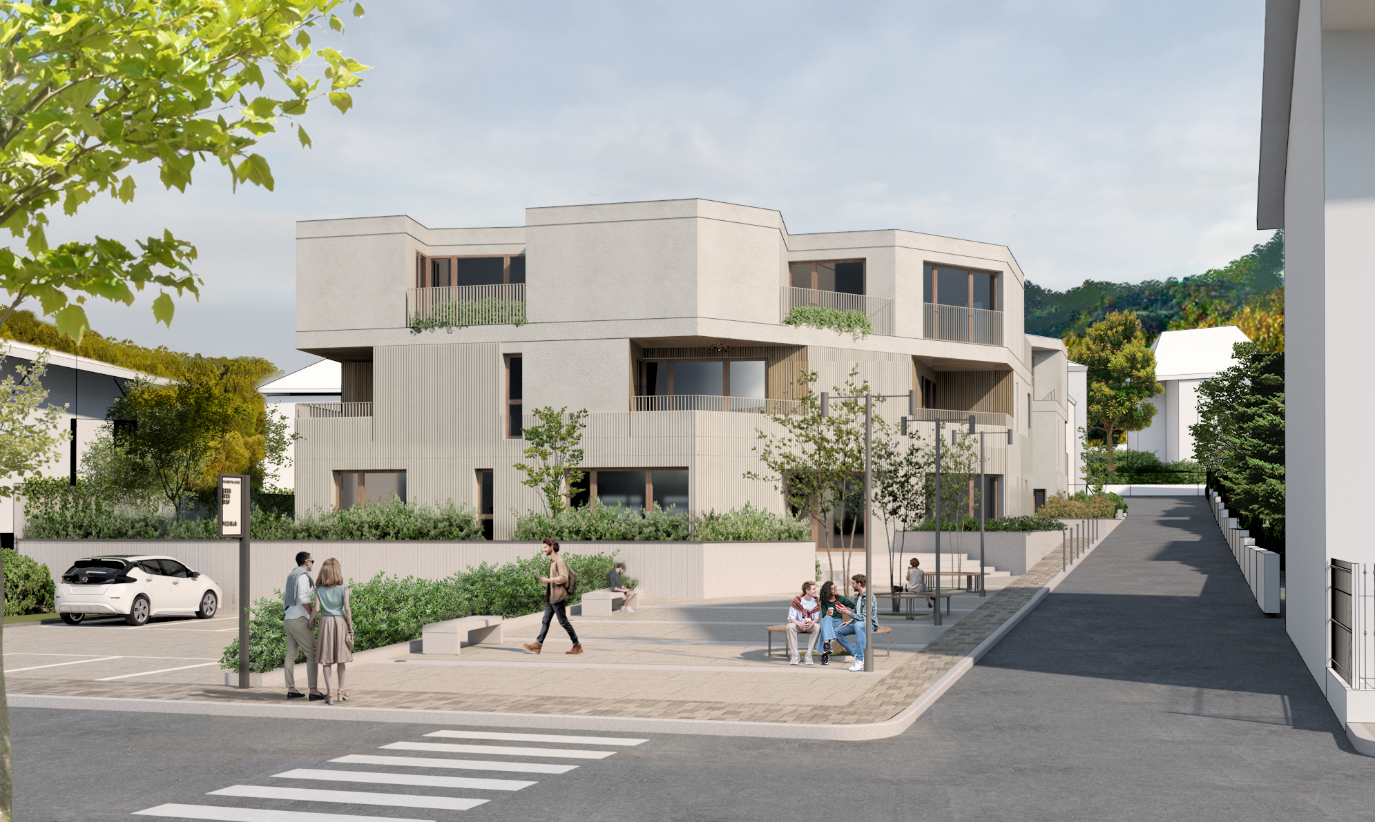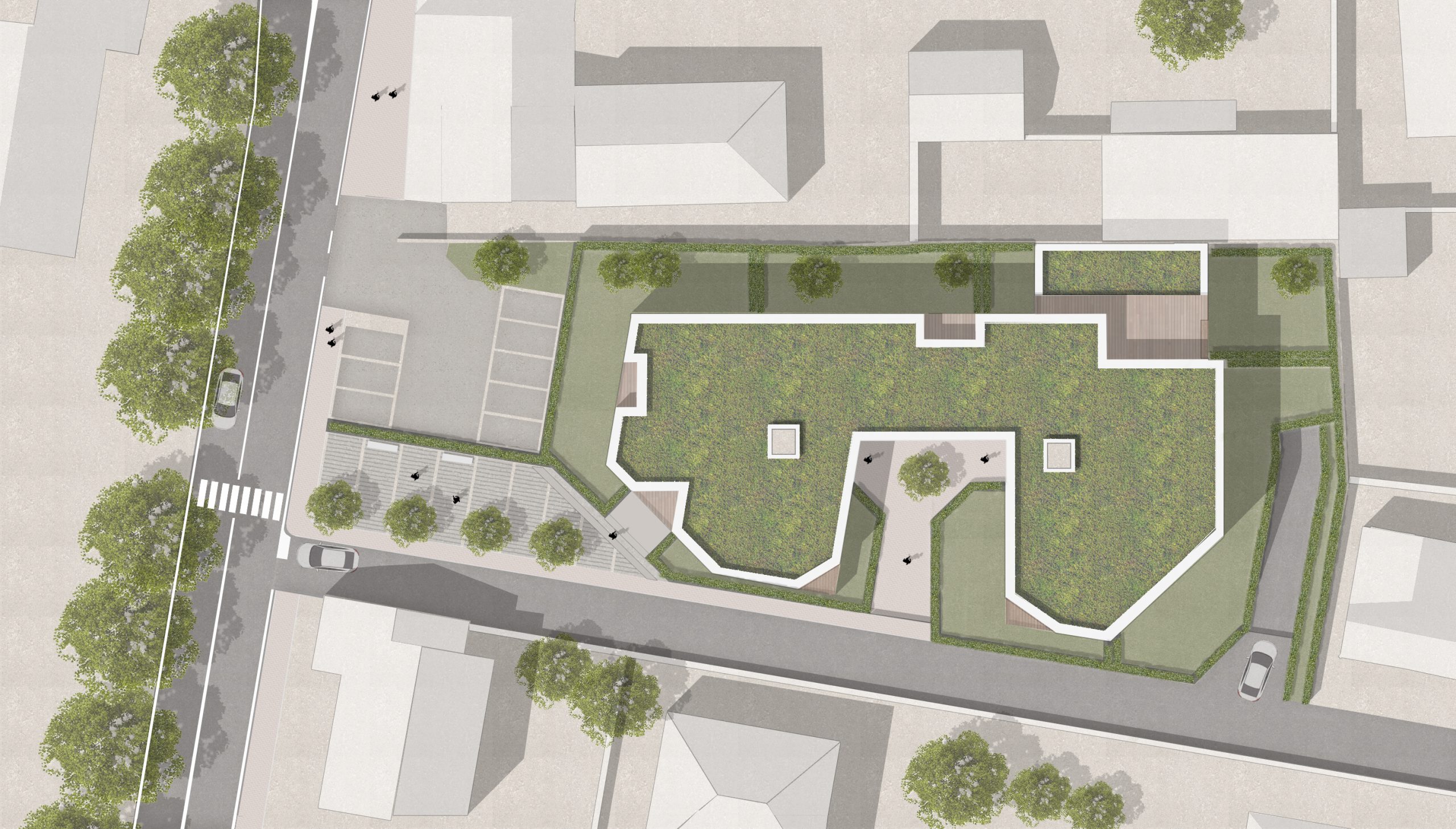 L’intervento ridefinisce integralmente il sistema degli spazi aperti, sostituendo un’area precedentemente occupata da un capannone e da un parcheggio con un assetto urbano strutturato, costituito oltre che dal nuovo edificio e dal ridisegno del parcheggio esistente, da una nuova piazzetta pubblica, percorsi pedonali di connessione e superfici verdi di mitigazione. Il rapporto tra spazi pubblici e privati è mediato da un sistema integrato di verde pubblico e privato, filtri vegetali e coperture a verde estensivo, con funzioni di mitigazione e di inserimento ambientale. L’organizzazione funzionale e la distribuzione delle superfici configurano un intervento residenziale coerente con il contesto urbano e le strategie di rigenerazione dell’area.