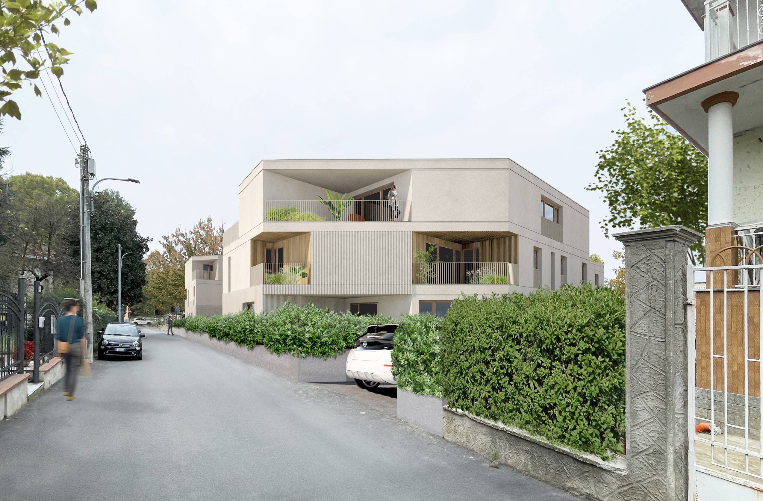 Il volume scavato consente l’ottimizzazione delle superfici utili e la riduzione dell’impatto volumetrico percepito, garantendo al contempo a tutte le unità residenziali l’accesso a spazi esterni privati quali logge, terrazzi e giardini pertinenziali. Le sottrazioni volumetriche generano inoltre una corte interna con funzione di cerniera distributiva e di accesso, che organizza i percorsi pedonali, assicura la leggibilità degli ingressi e regola la transizione tra spazio pubblico e ambiti residenziali.